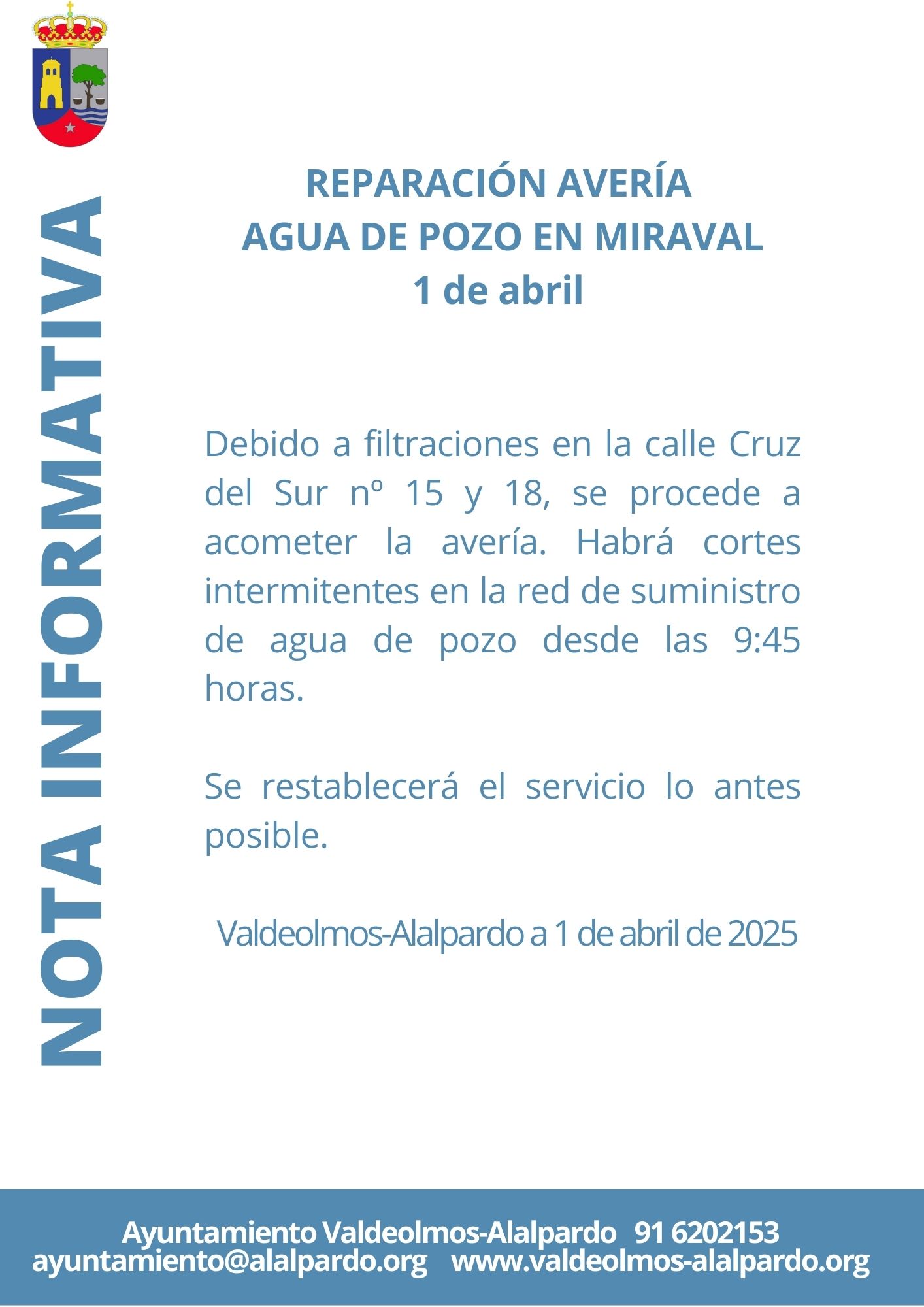 1 de abril: Corte de agua de pozo en Miraval por avería