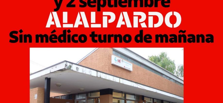 El Centro de Salud de Algete, del que dependen nuestros Consultorios, confirma que por falta de profesionales, no habrá médico en Alalpardo en turno de mañana los días 17, 19, 22, 29, 31 de agosto y 2 de septiembre.