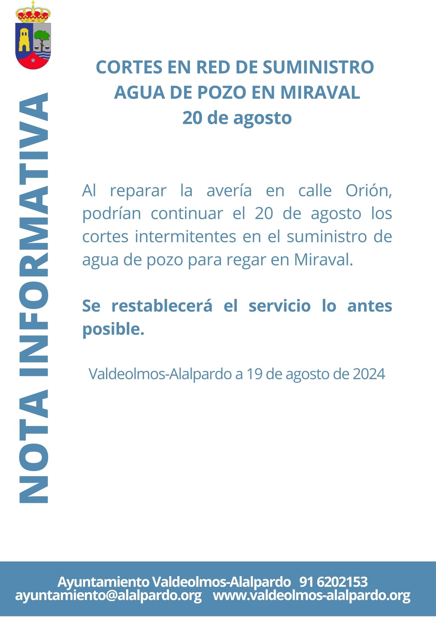 20 de agosto: Podrían continuar los cortes de agua para regar en Miraval » 20 agosto Miraval agua cortes
