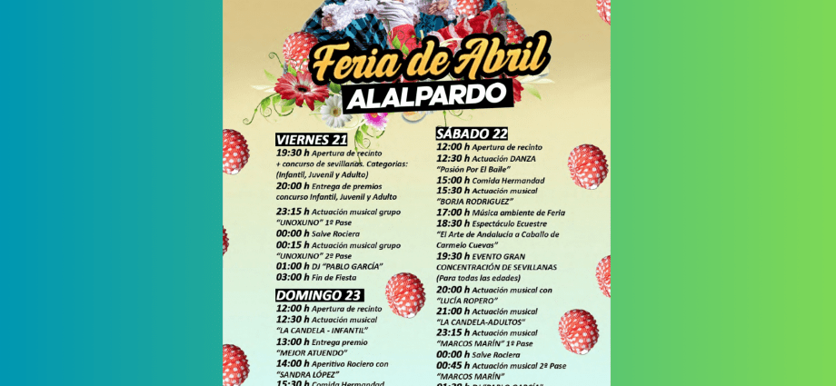 La Feria de Abril arranca el viernes 21 de abril con la apertura del Recinto y un Concurso de Sevillanas. Habrá premios en la categoría infantil, juvenil y adulto, actuaciones musicales, salve rociera y DJ. Imposible no estar el sábado y el domingo en la Feria de Abril.