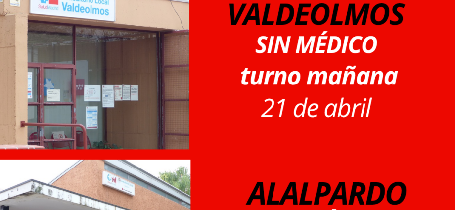 El Centro de Salud de Algete del que dependen nuestros Consultorios, confirma que no habrá médico el 21 de abril en Valdeolmos en turno de mañana y en Alalpardo en turno de tarde.