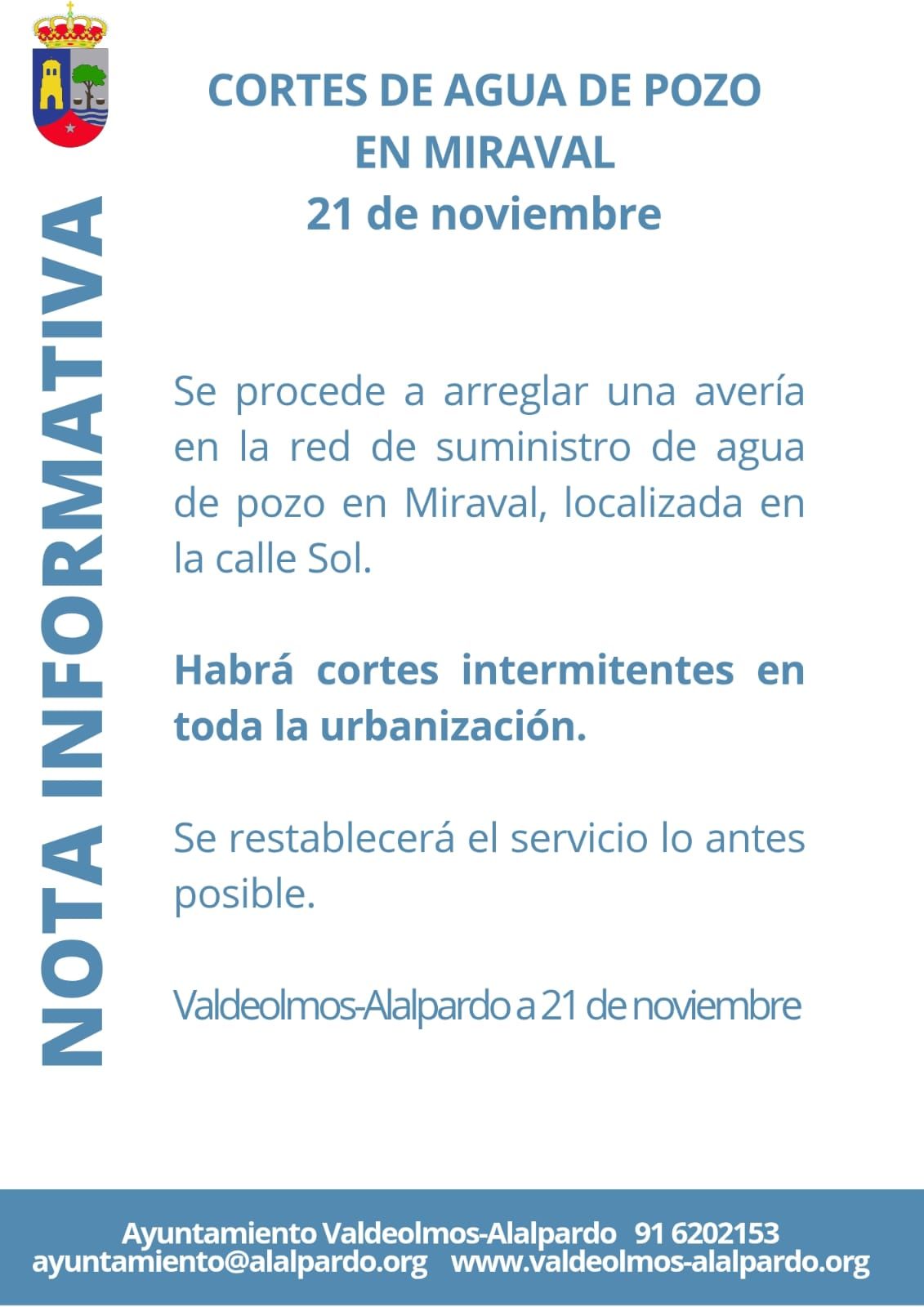 21 de noviembre: Cortes intermitentes de agua de pozo en Miraval