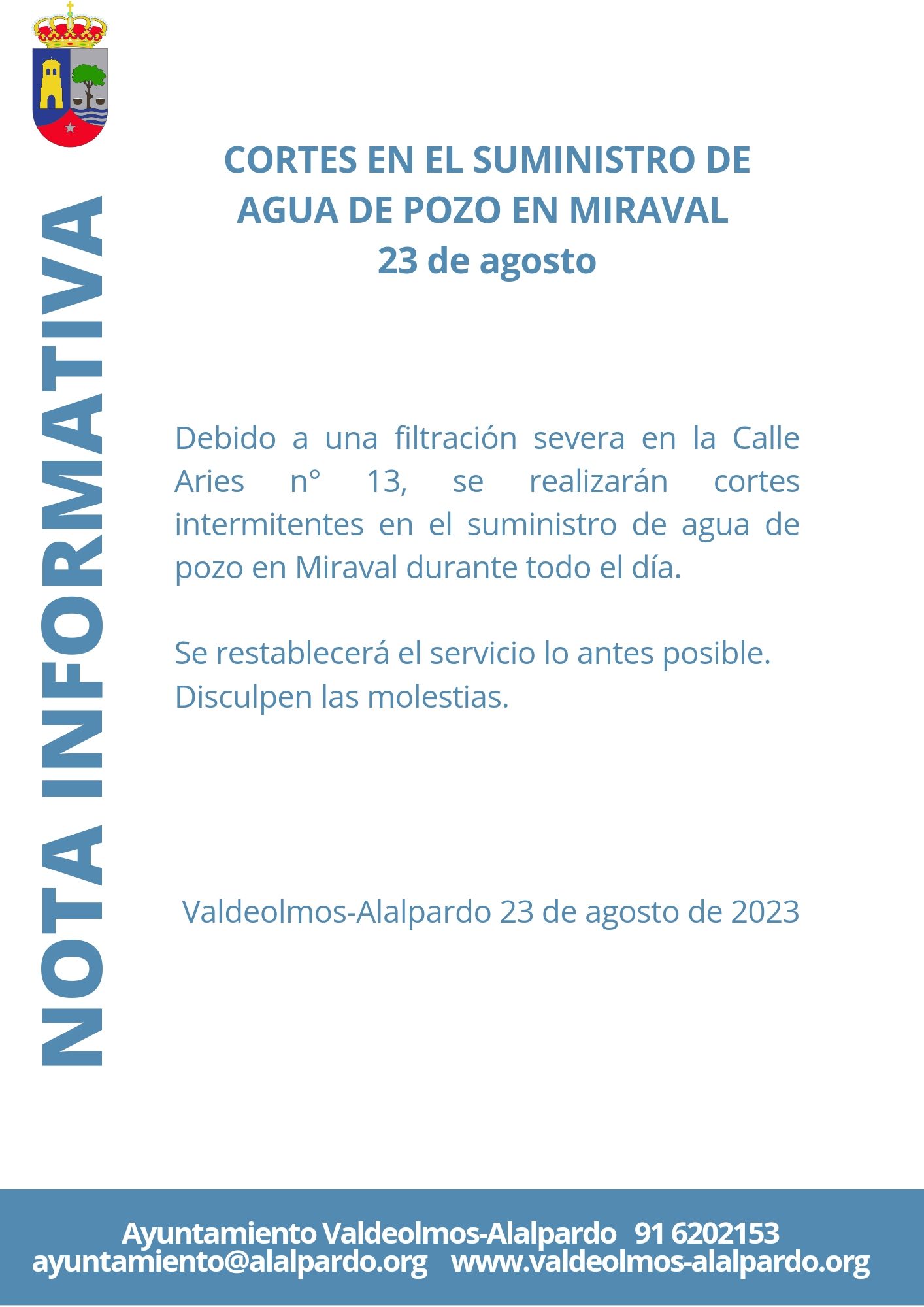 23 de agosto: Cortes en el suministro de agua de pozo en Miraval