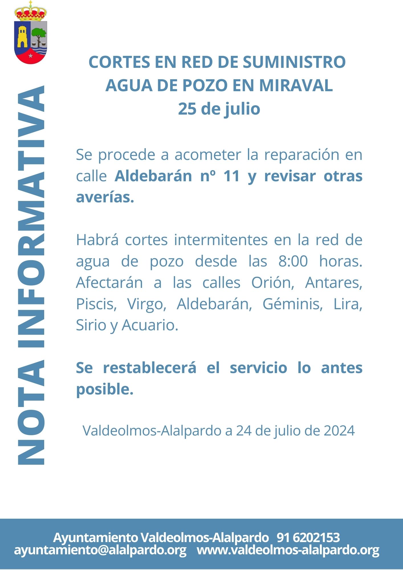 25 de julio: cortes de agua de pozo en Miraval por reparación de avería