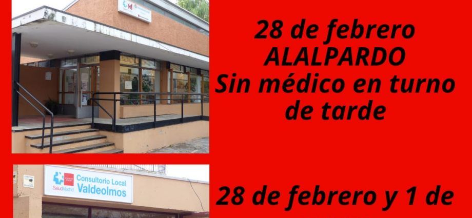 El Centro de Salud de Algete, del que dependen nuestros Consultorios, confirma que el 28 de febrero no habrá médico en Alalpardo en turno de tarde. El 28 de febrero y 1 de marzo no habrá médico en Valdeolmos en turno de mañana.