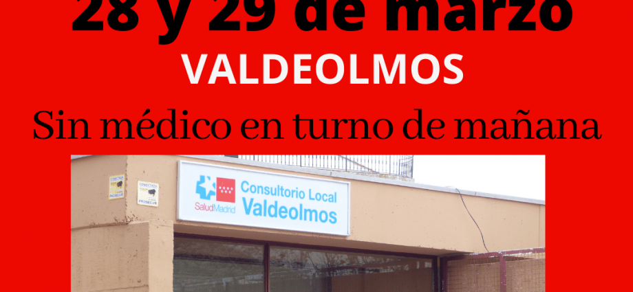 El Centro de Salud de Algete, del que dependen nuestros Consultorios, confirma que el 28 y 29 de marzo no habrá médico en Valdeolmos en turno de mañana.