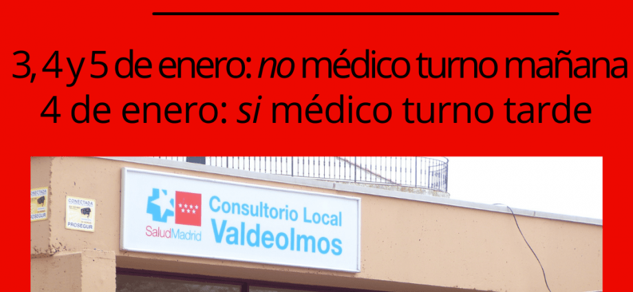 El Centro de Salud de Algete del que dependen nuestros Consultorios, confirma los turnos con o sin médico los días 3, 4 y 5 de enero en Valdeolmos.