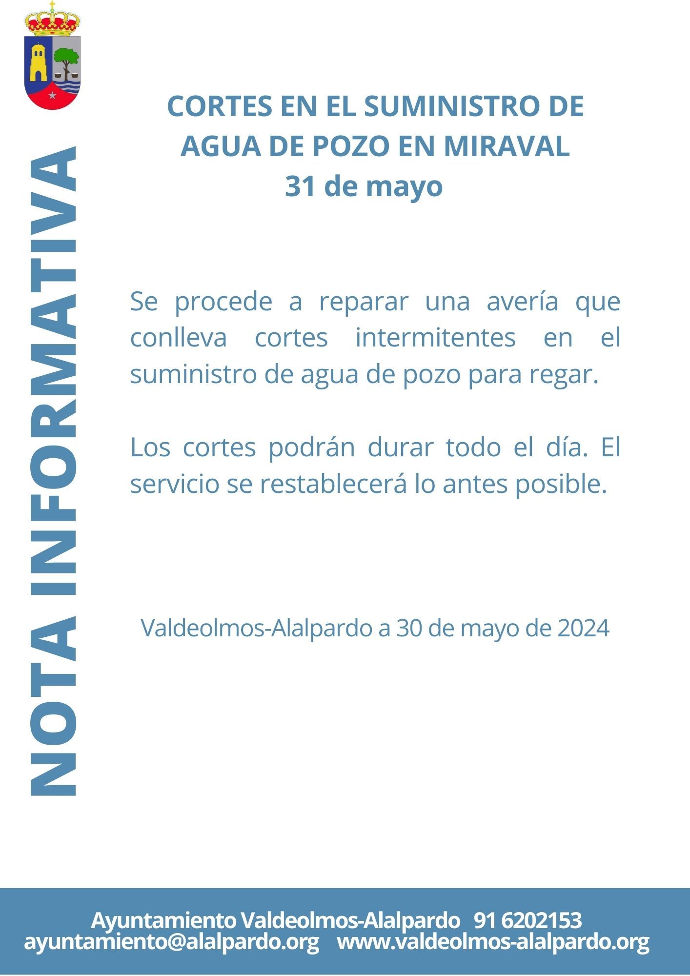 31 de mayo: Cortes en el suministro de agua de pozo en Miraval