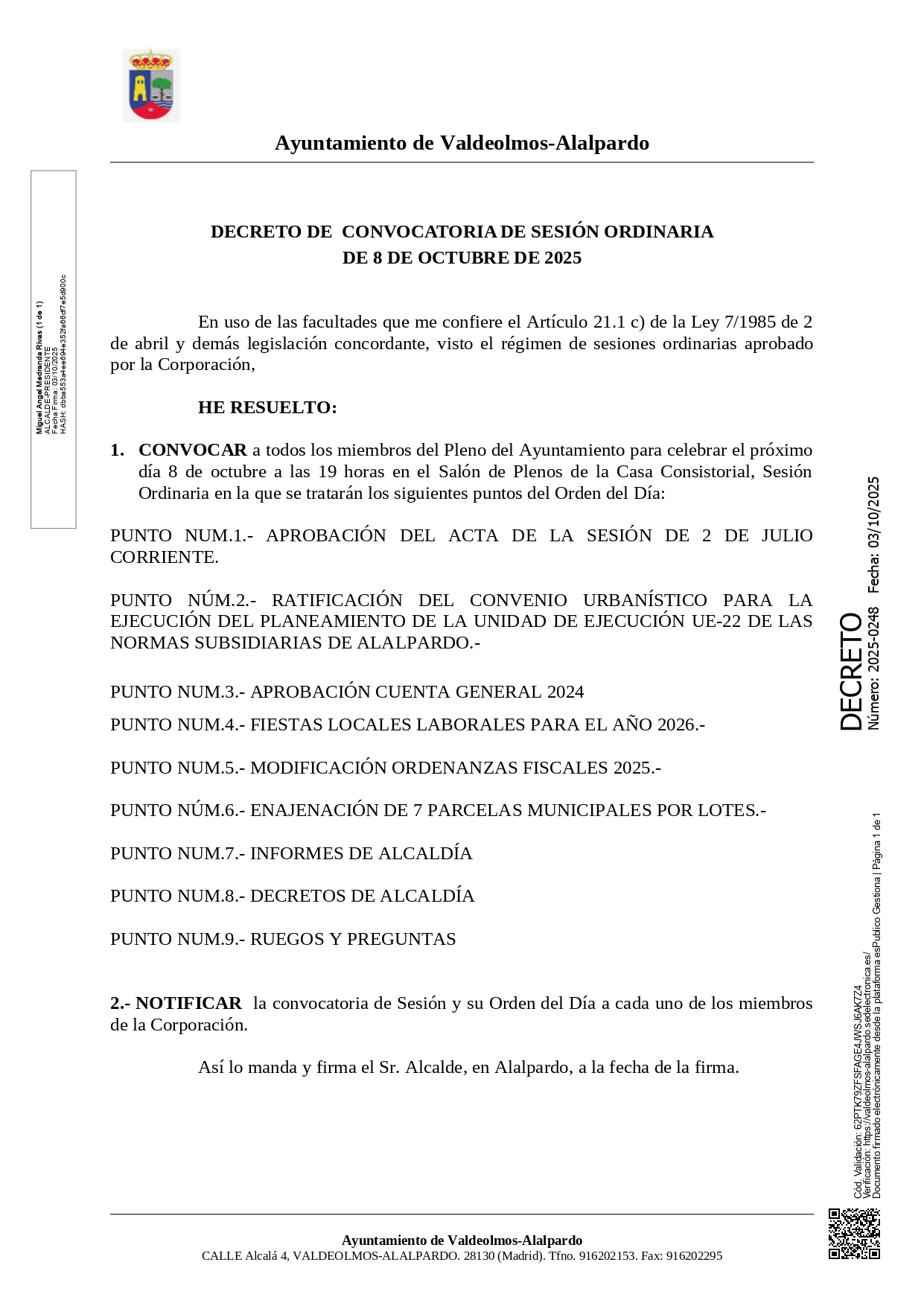 8 de octubre: Decreto de convocatoria de Pleno Ordinario