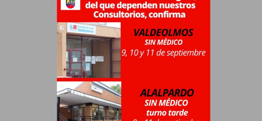 El Centro de Salud de Algete del que dependen nuestros Consultorios, confirma que no habrá médico 9, 10 y 11 de septiembre en Valdeolmos y 9 y 11 en turno de tarde en Alalpardo.