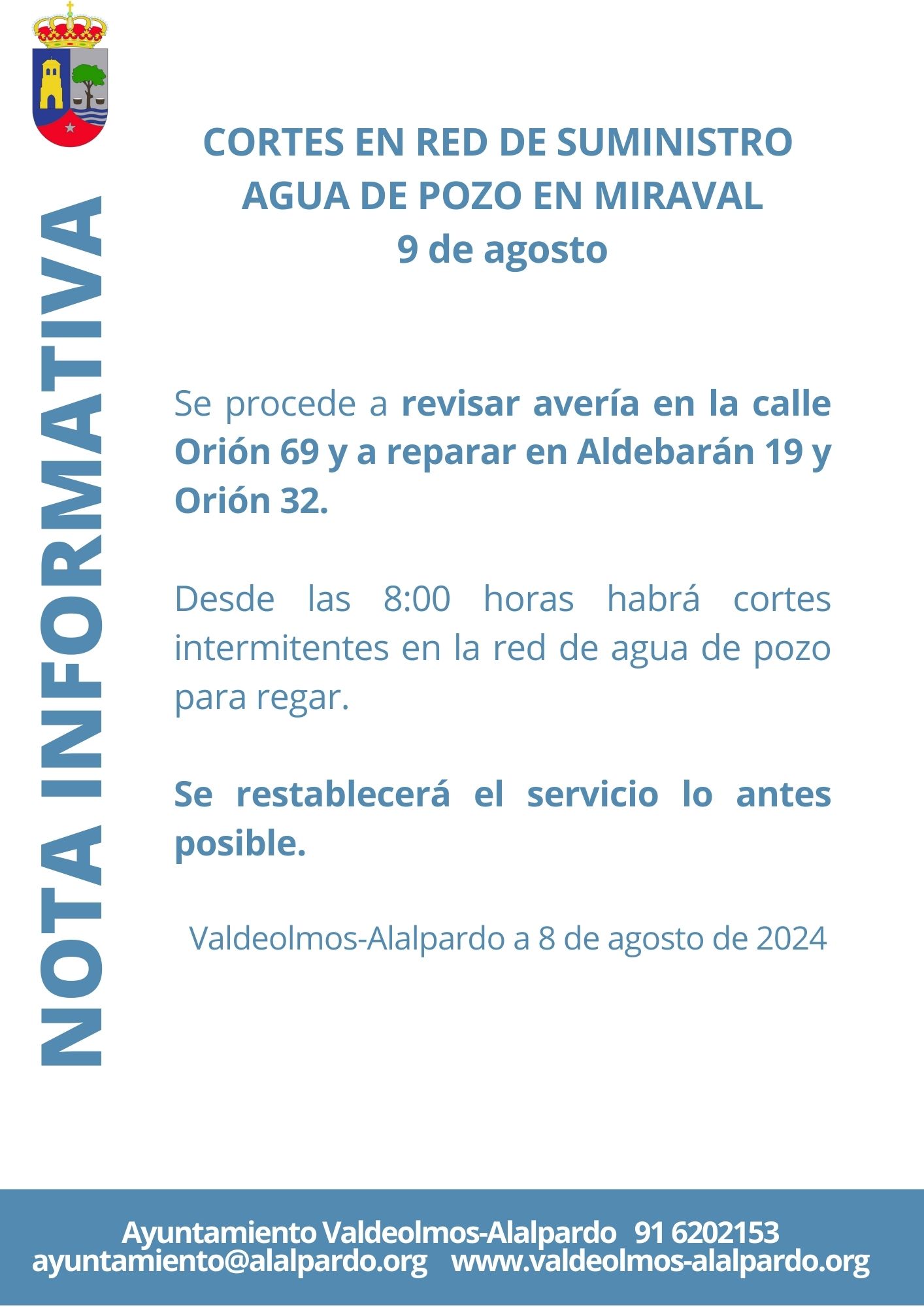 9 de agosto: Cortes en el suministro de agua de pozo en Miraval por averías