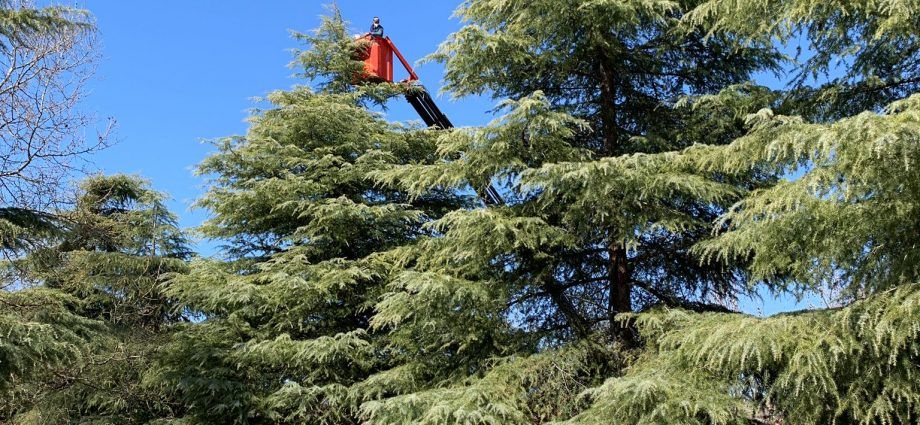 Los operarios municipales llegaron hasta los nidos de oruga procesionaria en lo alto de los cedros del Parque Nuestra Señora de Rosario subidos en una cesta y ayudados por una pluma.