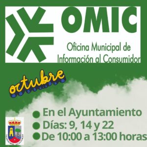 OMIC (Oficina Municipal de Información al Consumidor) Puede ayudarte con: Tramitación de reclamaciones y denuncias Arbitrajes de consumo Consultas generales sobre derechos y deberes como consumidor Asesoramiento especializado en materia de consumo. En el Ayuntamiento Octubre: 9, 14 y 22 De 10:00 a 13:00 horas