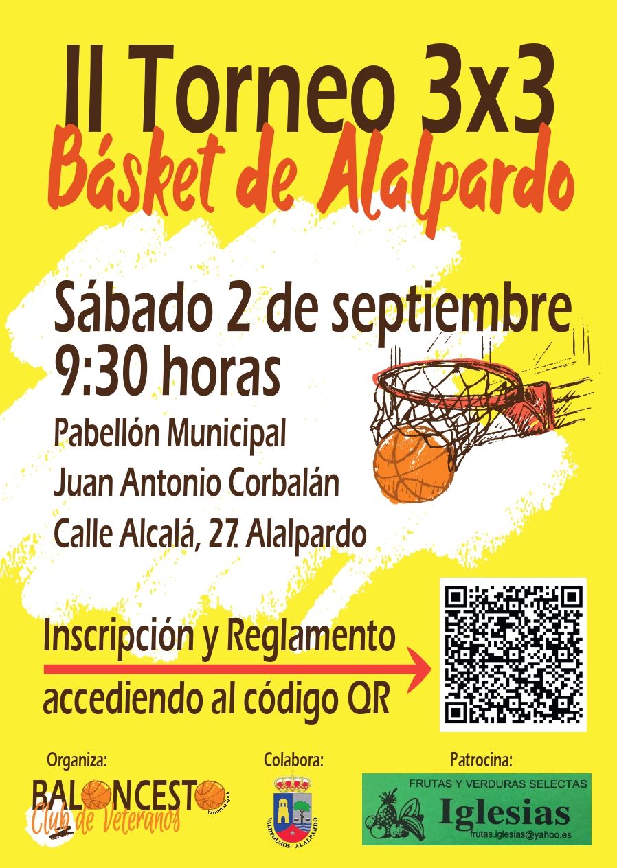¿Te apuntas al II Torneo 3x3 Básket de Alalpardo? Se juega el sábado 2 de septiembre a las 9:30 horas en el Pabellón Municipal Juan Antonio Corbalán en la calle Alcalá 27 de Alalpardo. Puedes inscribirte y ver el Reglamento del Torneo accediendo al Código QR del cartel. II TORNEO