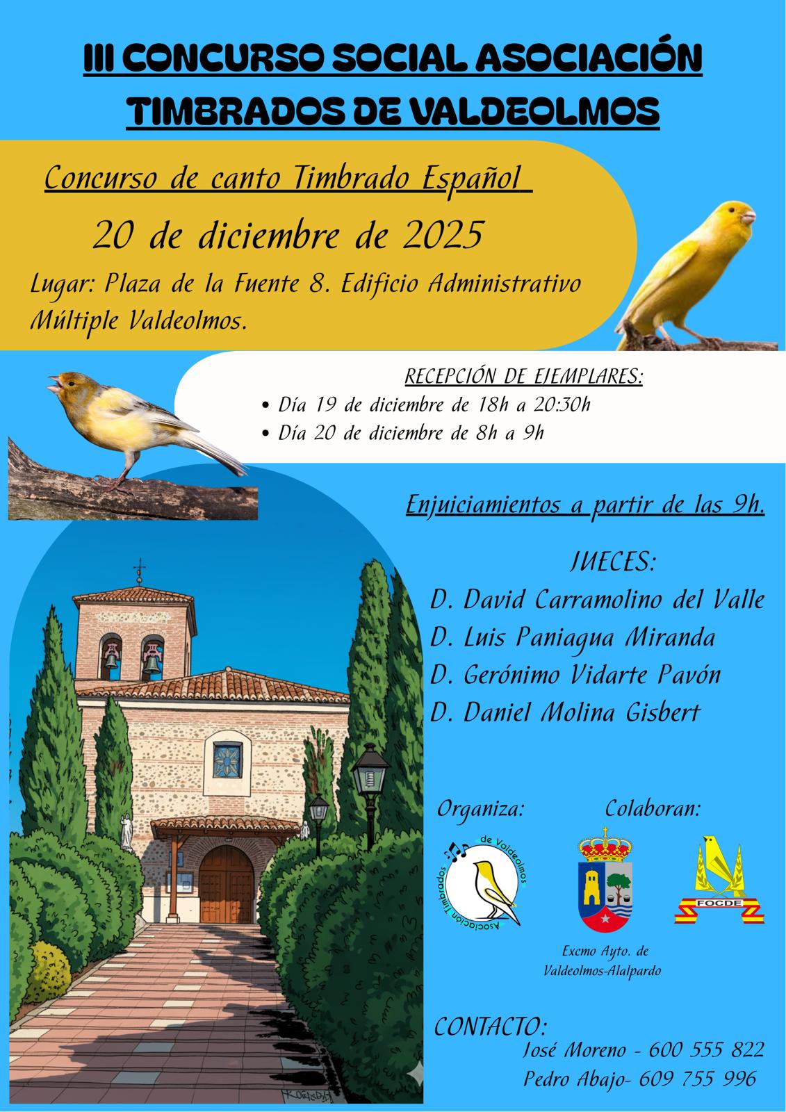 Edificio Administrativo de Valdeolmos Plaza Nacional nº 6III Concurso Social Asociación Timbrados de Valdeolmos Se trata de un Concurso de canto timbrado español. 20 de diciembre Edificio Administrativo, Plaza de la fuente, 8, Valdeolmos La recepción de ejemplares será el 19 de diciembre Enjuiciamiento a partir de las 9:00 horas. Jueces: D. David Carramolino, D. Luis Paniagua,