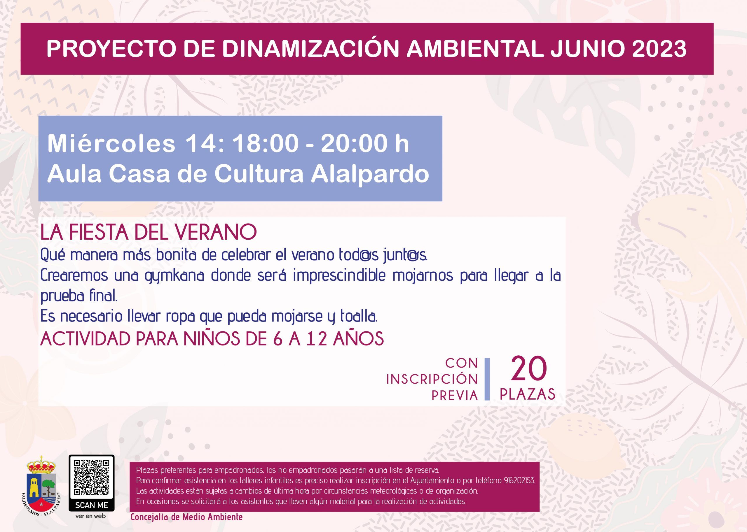 Aula Casa de la Cultura de Alalpardo Calle Egidos, 8, Alalpardo, Madrid, EspañaProyecto de Dinamización Ambiental - junio 2023 Miércoles 14 de junio: La Fiesta del Verano en el Aula de la Casa de la Cultura de Alalpardo. Actividad para niñ@s de 6 a 12 años. Desde octubre del año 2021 el Ayuntamiento de Valdeolmos-Alalpardo viene apostando por la realización de acciones