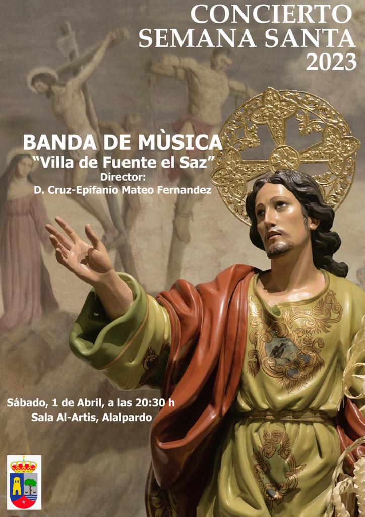 Sala Al Artis Calle Egidos, 8, Valdeolmos-Alalpardo, Madrid, EspañaConcierto de Semana Santa 2023 de la mano de la Banda de Música 'Villa de Fuente El Saz' con el director D. Cruz-Epifanio Mateo No te lo pierdas el sábado 1 de abril a las 20:30 horas en la Sala Al-Artis. CARTEL CONCIERTO DE EMANA SANTA