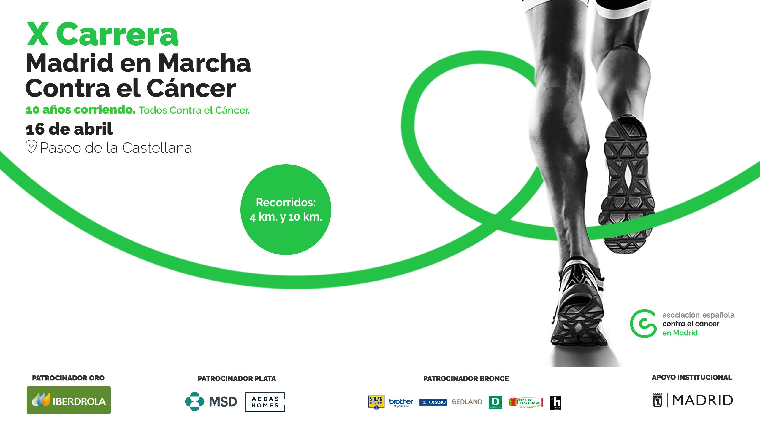 10 años cruzando la meta contra el Cáncer El domingo 16 de abril de 2023 volvemos al Paseo de la Castellana para la que será la edición más especial Carrera Madrid Contra el Cáncer, celebrando10 años corriendo todos juntos contra el cáncer. Contaremos con dos tradicionales circuitos de 4km y 10km, con salidas independientes, además de carreras infantiles y