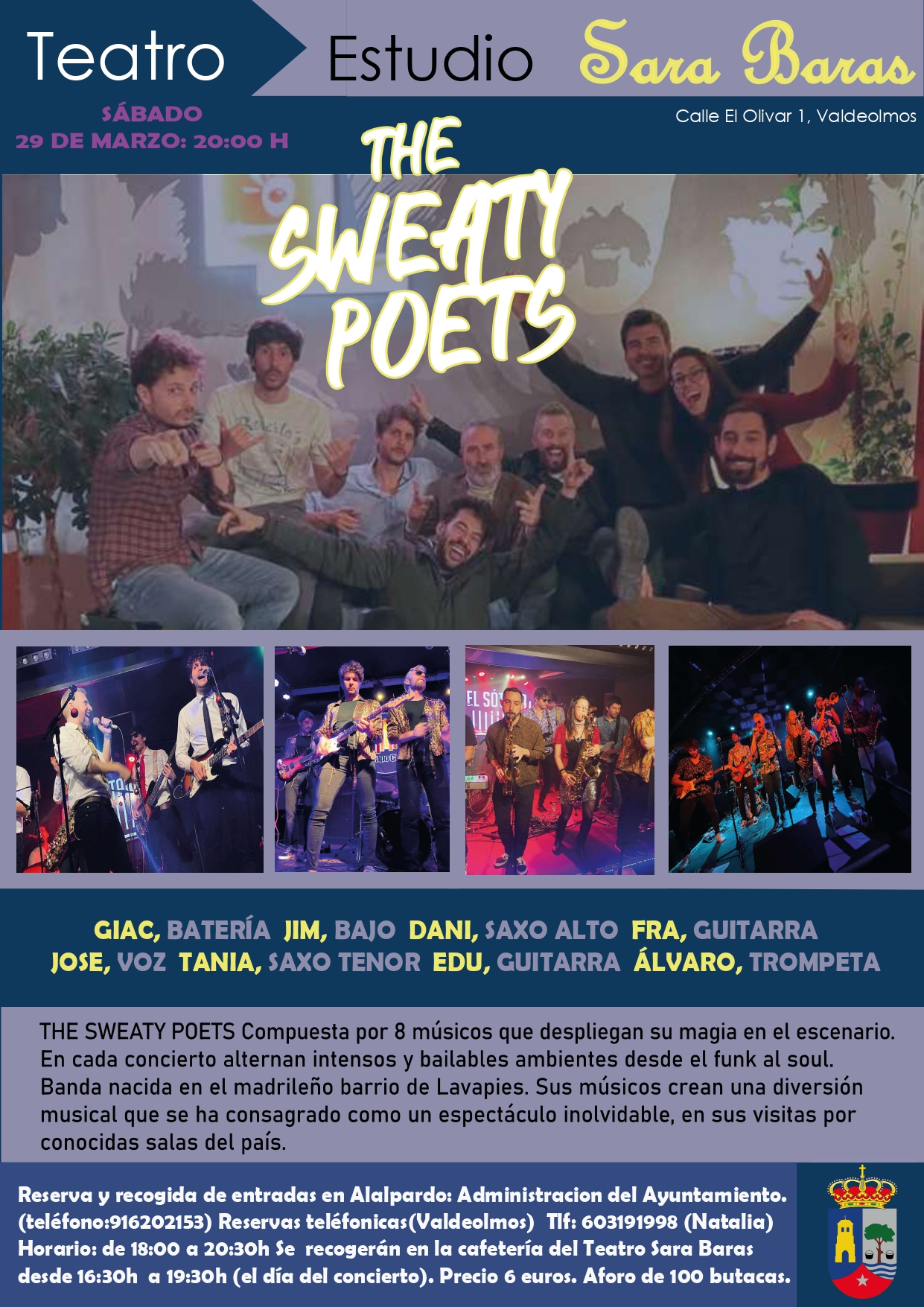 Teatro-Estudio Sara Baras C/ Olivar 1, ValdeolmosThe Sweaty Poets llevan su funk y soul al Teatro Estudio Sara Baras en Valdeolmos Los 8 músicos despliegan su magia en el escenario. Un espectáculo inolvidable y muy bailable. Sábado 29 de marzo 20:00 horas Teatro Sara Baras, C/ El Olivar 1, Valdeolmos Precio 6 euros Reserva y recogida
