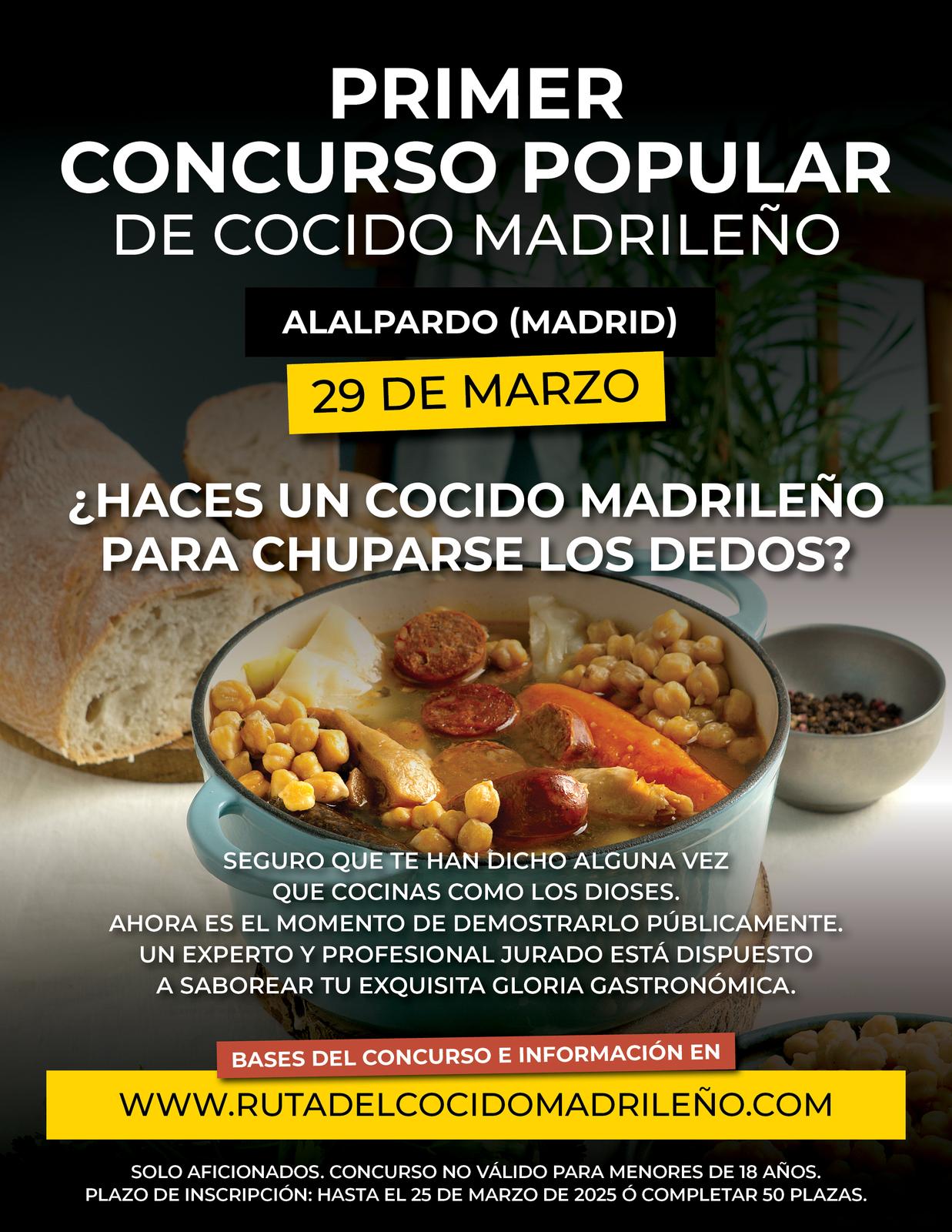 Plaza de la Comunidad de Madrid Alalpardo, Madrid¿Haces un cocido madrileño para chuparse los dedos? El Concurso es una iniciativa gastronómica organizada por ¡Qué rico España! La Ruta del Cocido Madrileño cumple 15 años y abre las puertas de las cocinas de las familias que quieran participar en este sabroso acontecimiento ante un jurado profesional en Alalpardo.