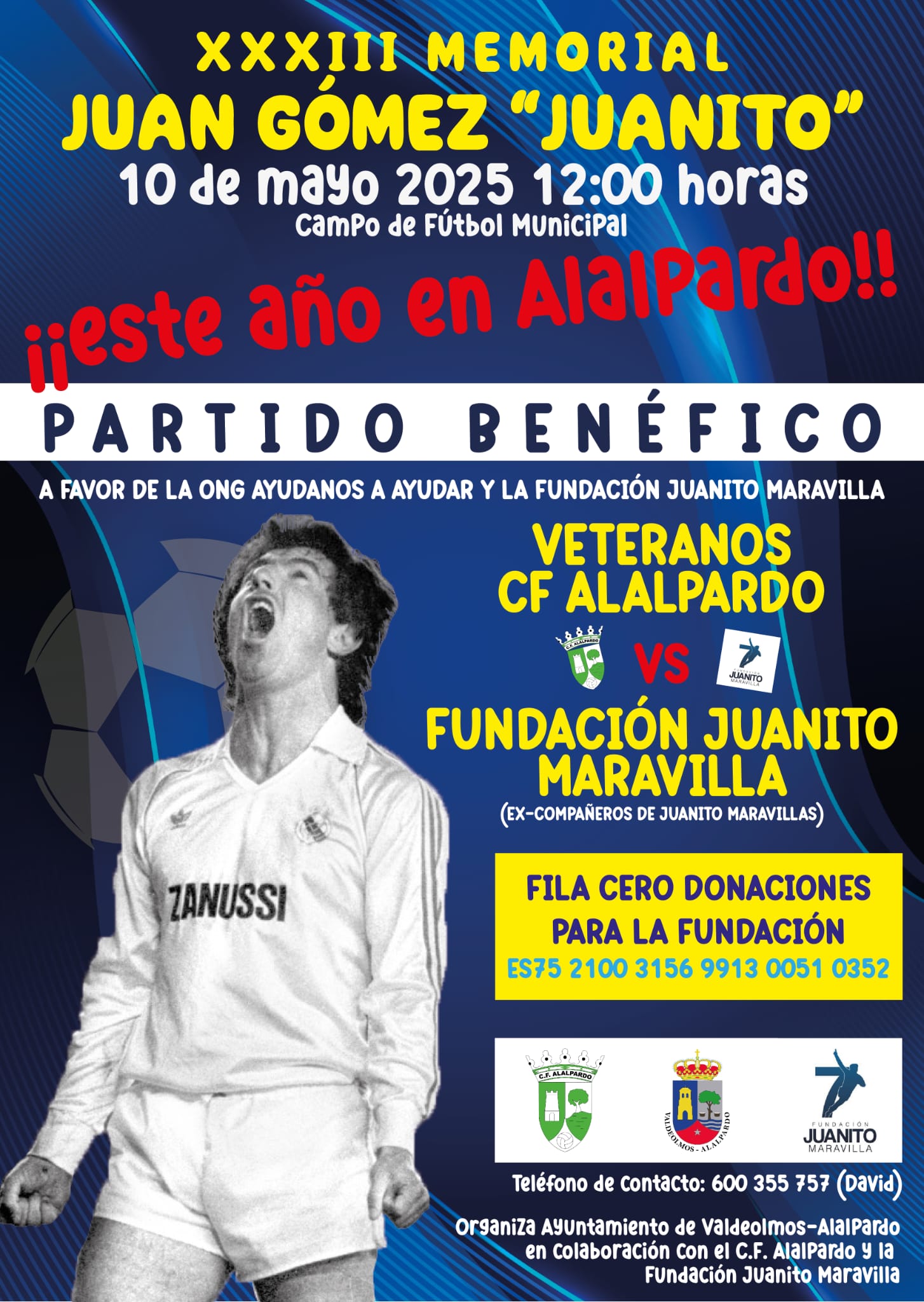 Campo de Fútbol Municipal de Alalpardo Calle Alcalá, 25, Alalpardo, Madrid, EspañaPartido benéfico ex compañeros de Juanito Maravilla contra veteranos del C.F. Alalpardo Se cumplen 33 años del fallecimiento del jugador de fútbol en un accidente de tráfico. 2 de abril de 1992. La Fundación Juanito Maravilla nace inspirada por el espíritu del mítico 7 blanco con el propósito de transformar