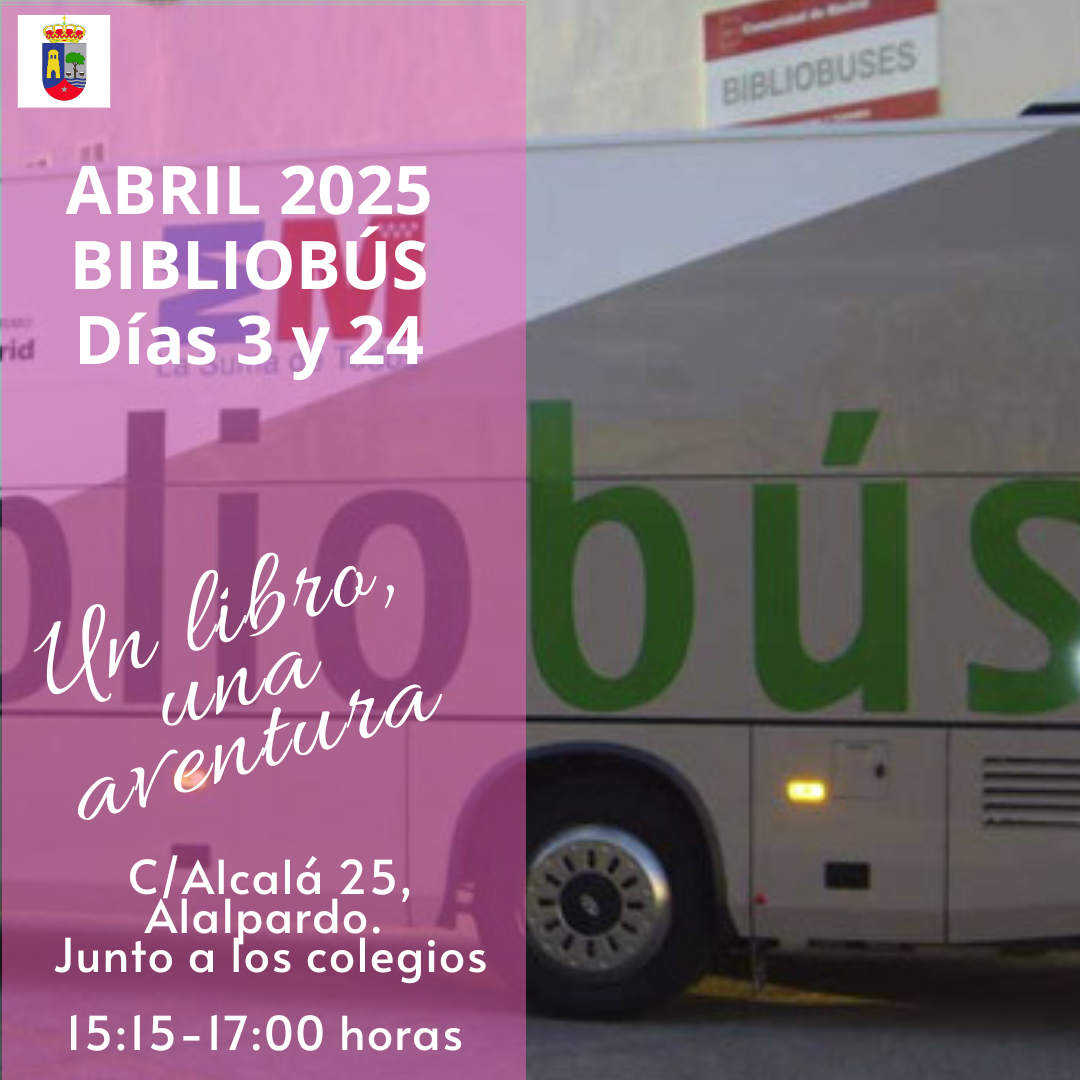 Calle Alcalá 25El Bibliobús vuelve al municipio el 3 y 24 de abril Como siempre, llega cargado de revistas, libros, cómics, CD, y DVD. Te espera en la Calle Alcalá 25 junto a los colegios, de 15:15 a 17:00 horas. Entra y te sorprenderás en el autobús convertido en biblioteca móvil. Hay