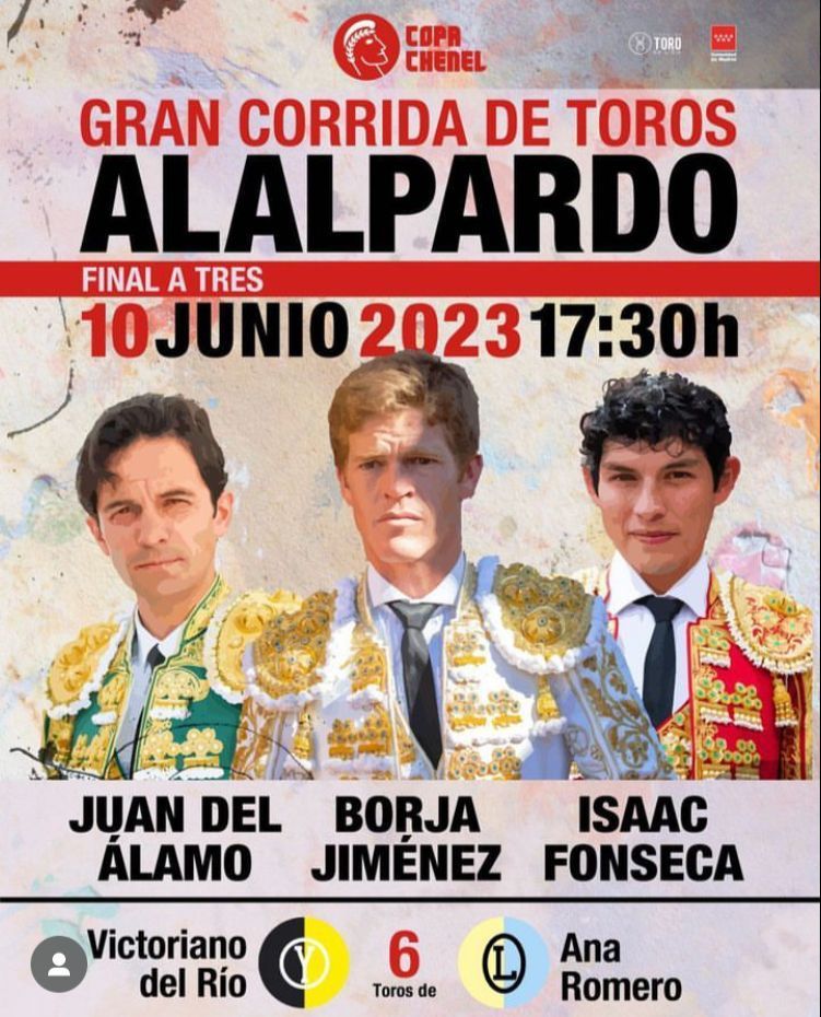 Plaza de Toros de AlalpardoCopa Chenel en Alalpardo - Final a tres el 10 de junio a las 17:30 horas La final a tres será el 10 de junio en la Plaza de Toros de Alalpardo, con toros de Ana Romero y Victoriano del Río. No te pierdas a los toreros que llegan a