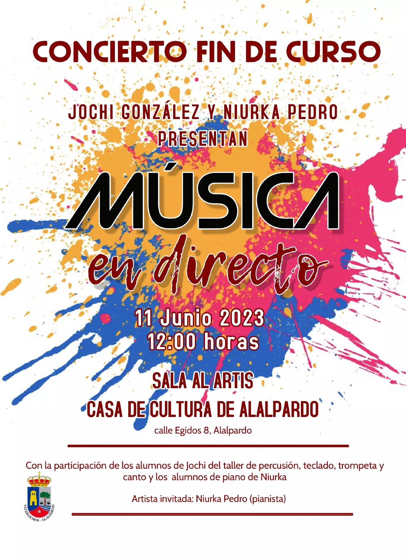 Sala Al Artis Calle Egidos, 8, Valdeolmos-Alalpardo, Madrid, EspañaMúsica en directo el domingo 11 de junio a las 12:00 horas en la Sala Al-Artis - Concierto Fin de Curso Con la participación de los alum@s de Jochi del taller de persecución, teclado, trompeta y canto y los alumn@s de piano de Niurka. Concierto de Fin de Curso con