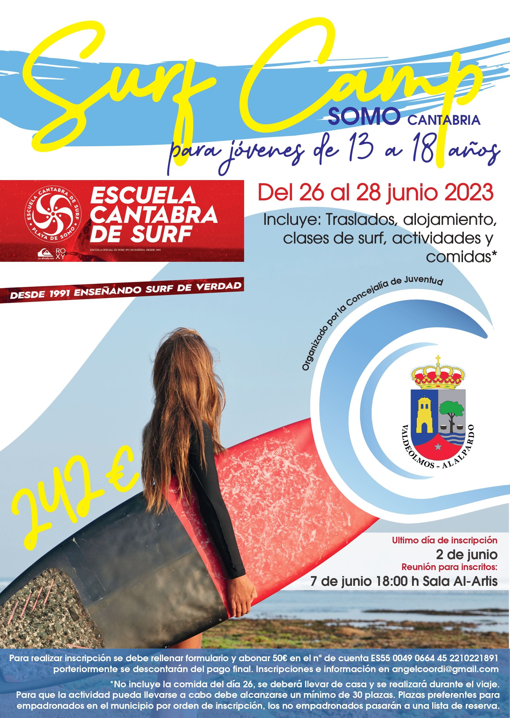 Campamento de Surf para jóvenes de entre 13 y 18 años en la playa de Somo, Cantabria del 26 al 28 de junio Incluye traslados, alojamientos, clases de surf, actividades y comidas. Precio: 242 euros Último día de inscripción: 2 de junio Reunión para inscritos: 7 de junio 18:00 horas