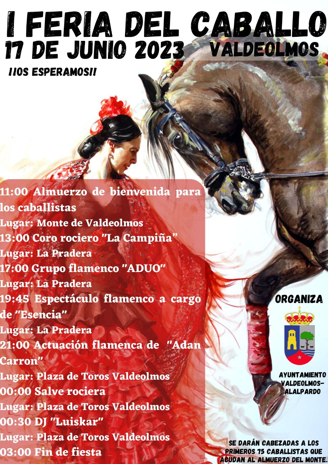 La I Feria del Caballo en Valdeolmos se celebra el 17 de junio Empieza a las 11 de la mañana y termina sobre las 3 de la madrugada. Un día completo desde el almuerzo a los caballistas, pasando por coros rocieros, espectáculos flamenco, salve rociera y DJ. I Feria del