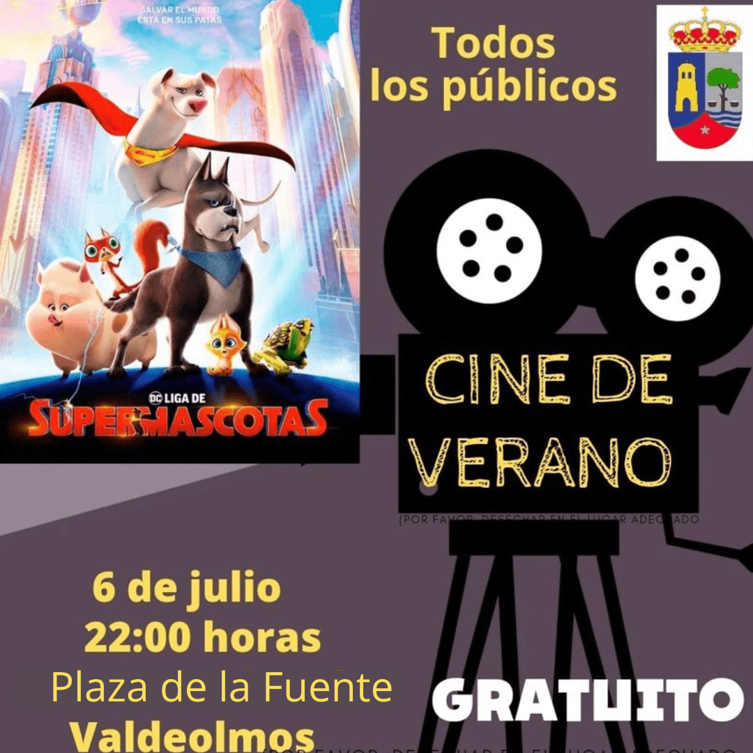 Plaza de la Fuente de Valdeolmos Plaza de la Fuente, ValdeolmosNo hay verano sin Cine de Verano SINOPSIS 'SUPERMASCOTAS': Krypto, el perro de Superman, forma un equipo de mascotas con superpoderes para rescatar a su dueño después de ser secuestrado y de que Liga de Justicia fuese capturada por el malvado Lex Luthor. Jueves 6 de de julio 22:00 horas