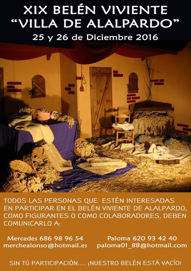 Se convoca una reunión de Figurantes y Colaborades del XIX Belén Viviente Villa de Alalpardo el 27 de noviembre a las 18:30 en la Casa de la Cultura. Se ruega máxima asistencia porque nuestro Belén está vacío sin tu participación.