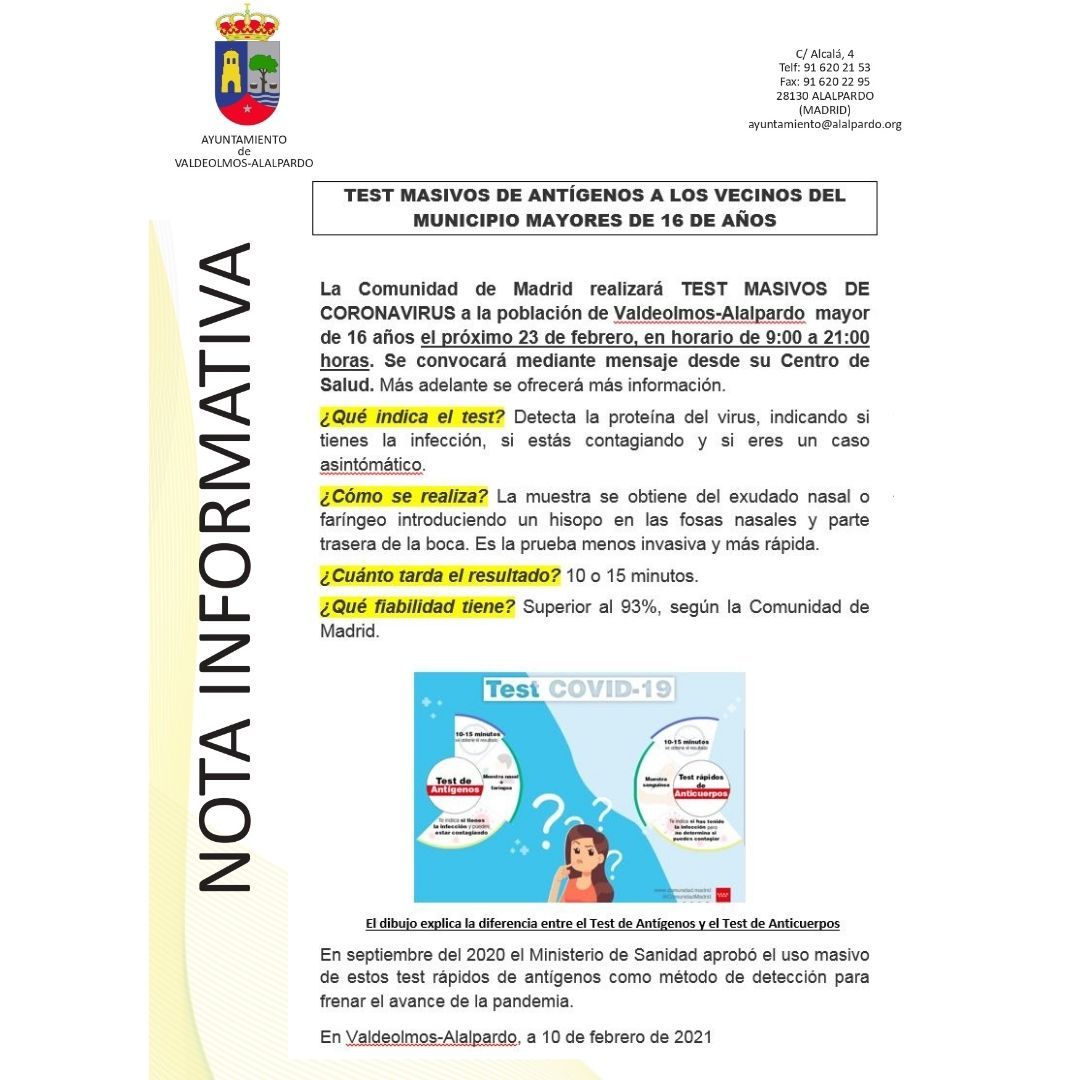 24 y 25 de febrero todos los vecinos de Valdeolmos-Alalpardo se harán test de antígenos excepto los niños menores de 6 años