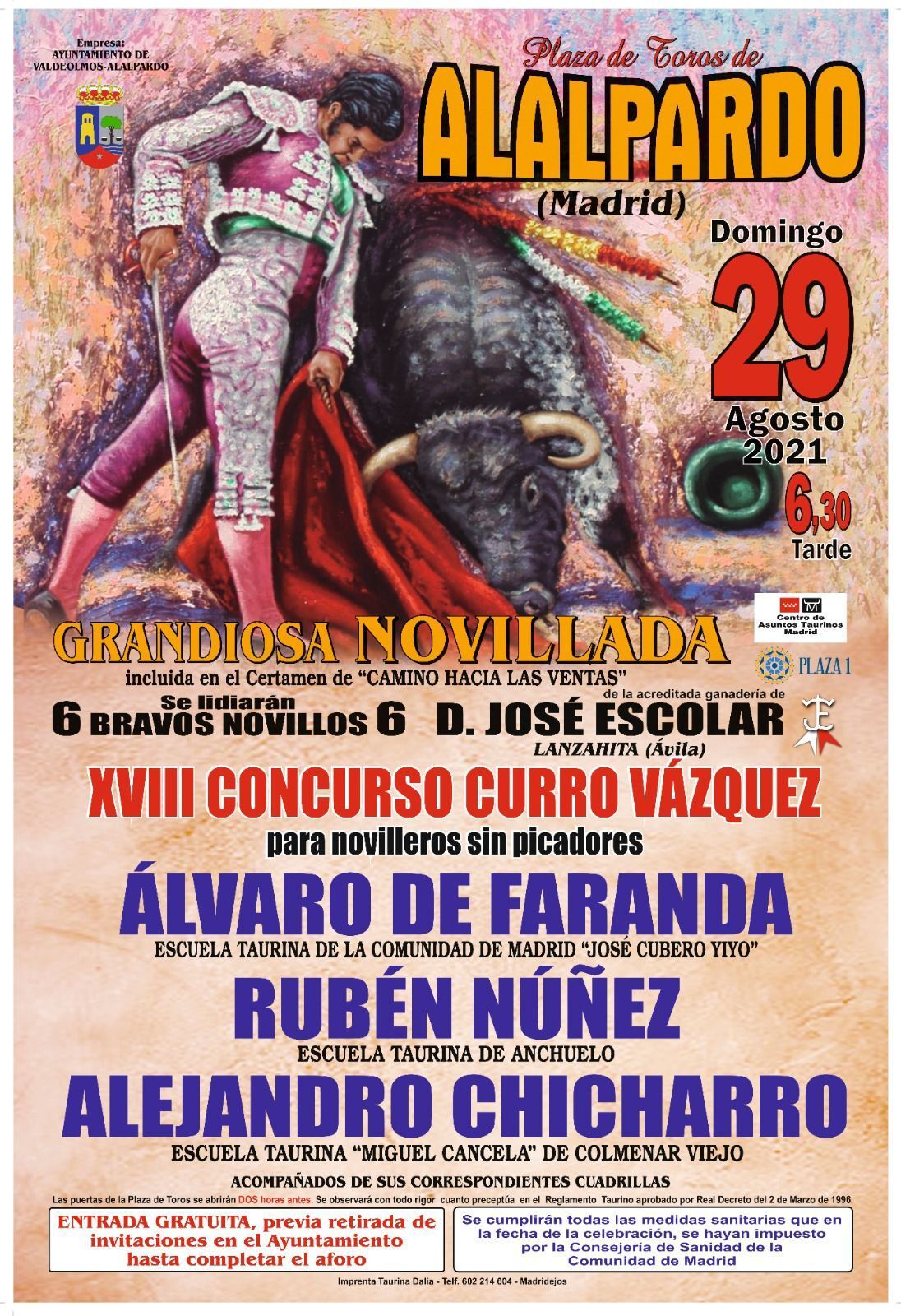 Grandiosa novillada en la Plaza de Toros de Alalpardo el 29 de agosto, 18:30 horas. Entrada gratuita previa retirada de invitaciones en el Ayto. hasta completar aforo.