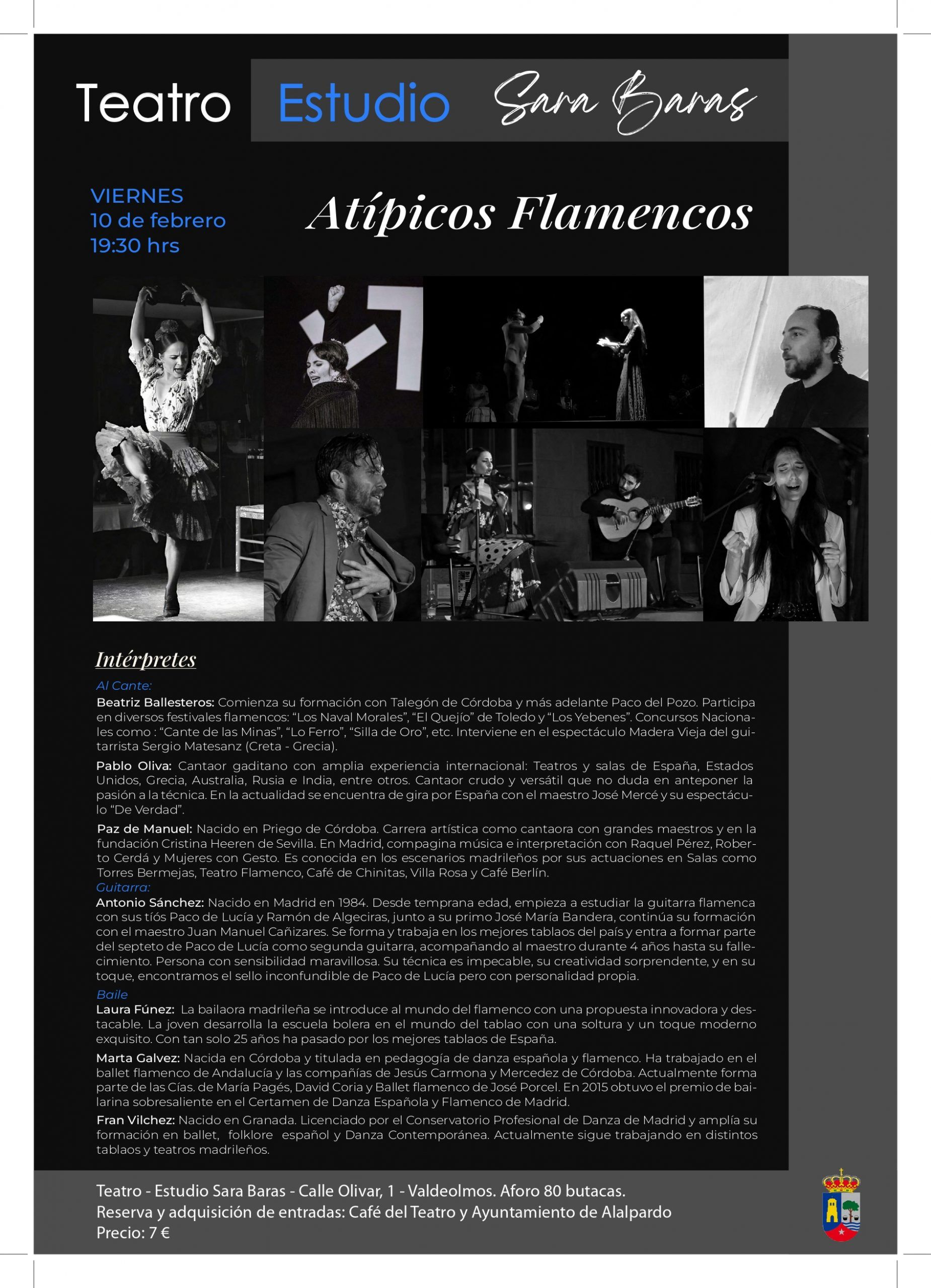 Espectáculo 'Atípicos flamencos' en el Teatro Sara Baras el viernes 10 de febrero a las 19:30 horas 3 cantaores cordobeses y gaditanos, el guitarrista sobrino de maestro Paco de Lucía y 3 bailaores forman el elenco del espectáculo flamenco 'Atípicos Flamencos' que no te dejará indiferente. Reserva y adquisición de