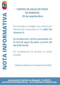 Se procede a arreglar una avería en la calle Sol nº 9. El arreglo conlleva realizar cortes puntuales de agua de pozo desde las 8:00 horas.