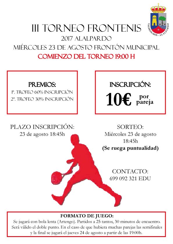 El Campeonato de Frontenis tendrá lugar el 23 de agosto a las 19:00 horas en el Frontón Municipal de Alalpardo.