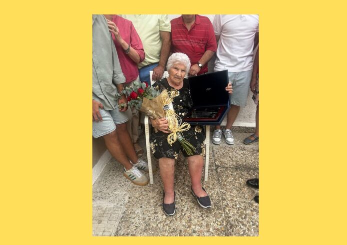 ‘A Dolores Pérez Alcobendas en conmemoración de sus 100 años de vida, un siglo de sabiduría, fortaleza y amor que inspiran a quienes la rodean. Con profundo cariño, respeto y admiración de su pueblo VALDEOLMOS’. 29 de agosto de 2025