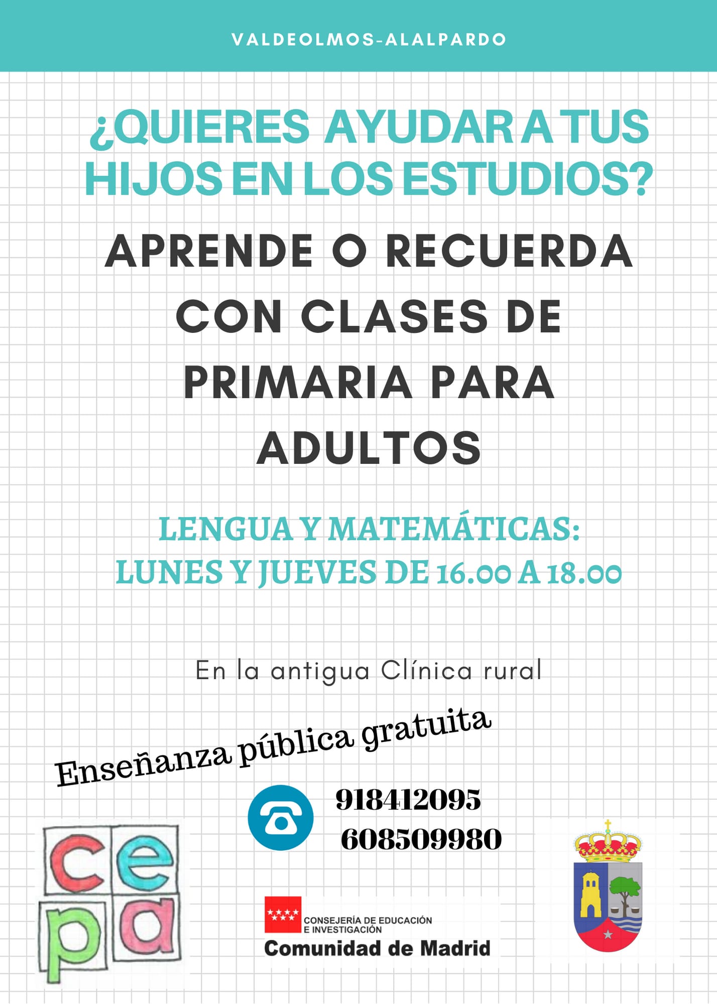 En la antigua Clínica rural puedes asistir a CLASES GRATUITAS DE LENGUA Y MATEMÁTICAS PARA ADULTOS los lunes y jueves de 16:00 a 18:00 horas.