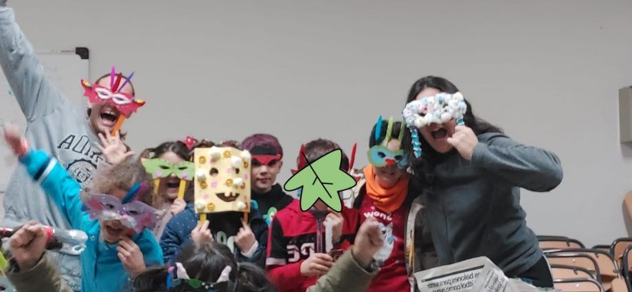 Divertido taller infantil ‘Enmascárate’ con material reciclado durante dos horas en el Aula de la Casa de la Cultura de Alalpardo. Una actividad dentro del Proyecto de Dinamización Ambiental.