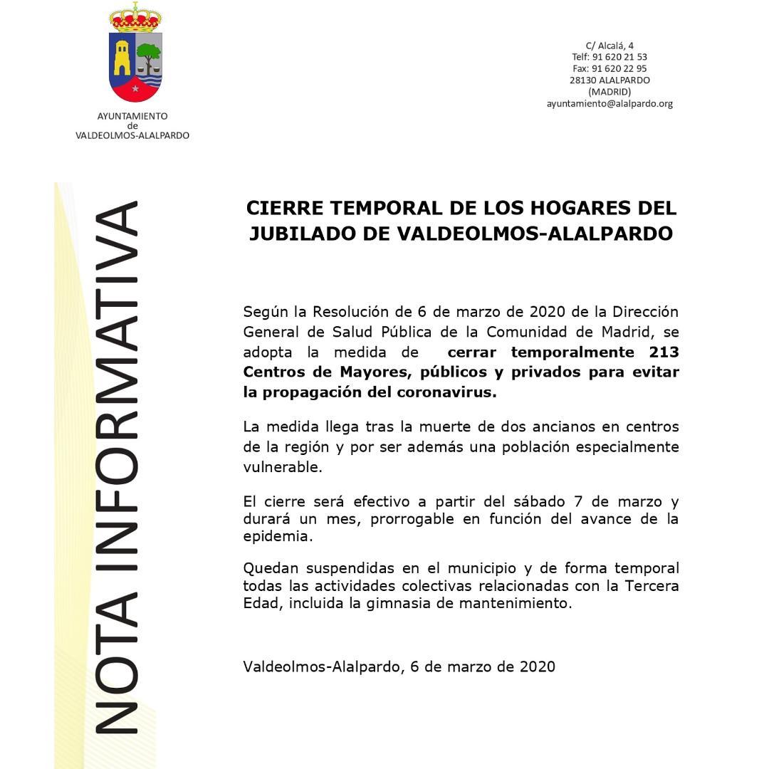 NOTA INFORMATIVA: Cierre temporal de los Hogares del Jubilado en el municipio »