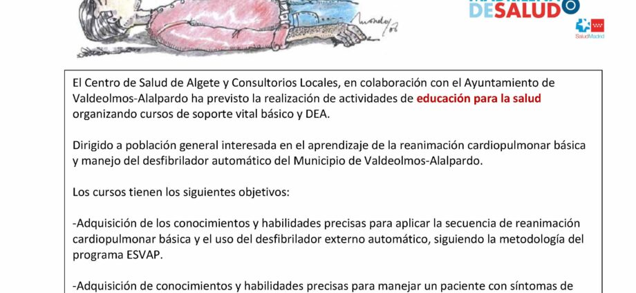 Curso dirigido a la población general interesada en el aprendizaje de la reanimación cardiopulmonar básica y manejo del desfibrilador automático del municipio. Actividades previstas por el Centro de Salud de Algete y Consultorios Locales y organizadas por la Escuela Madrileña de Salud y por la Sociedad Española de Medicina de Familia y Comunitaria.