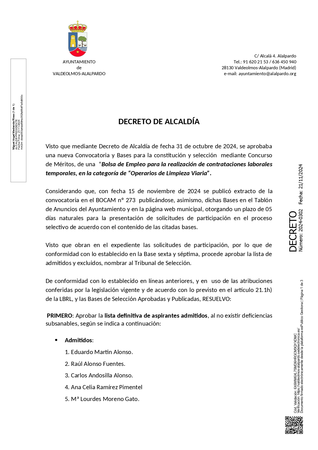 Decreto de Alcaldía sobre Bolsa de Empleo – Operarios de Limpieza Viaria