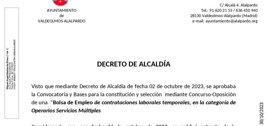 Se convoca a los aspirantes para la prueba prevista en la fase de oposición que tendrá lugar el 31 de octubre a las 9:00 horas en la sede del Ayuntamiento (C/ Alcalá 4, Alalpardo) debiendo acudir con el DNI/NIE.
