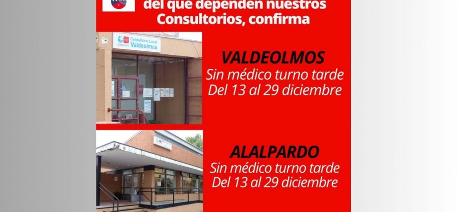 El Centro de Salud de Algete del que dependen nuestros Consultorios, confirma que no habrá médico en Alalpardo ni en Valdeolmos en turno de tarde los siguientes días: