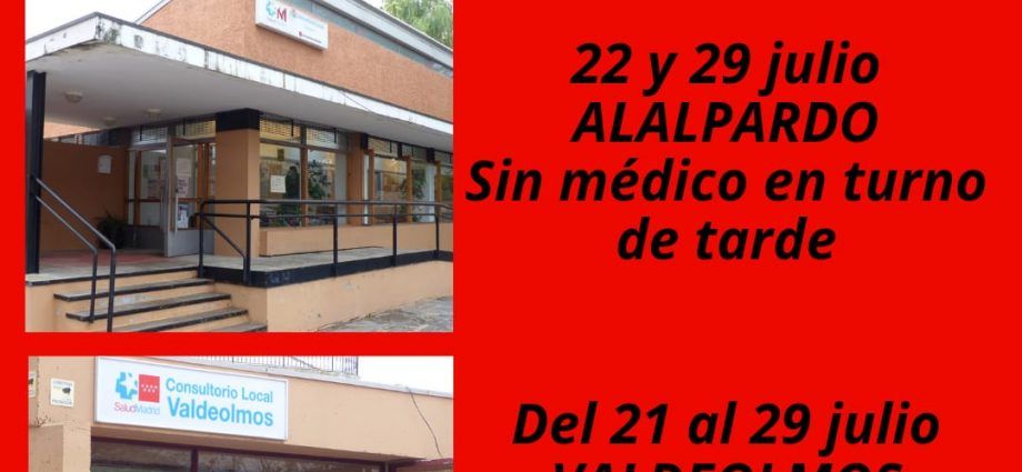 El Centro de Salud de Algete, del que dependen nuestros Consultorios, confirma que no habrá médico en Valdeolmos en turno de mañana del 21 al 29 de julio y en Alalpardo en turno de tarde los días 22 y 29 de julio.