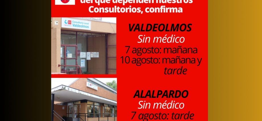 El Centro de Salud de Algete, del que dependen nuestros Consultorios, confirma que no habrá médico el 7 de agosto en turno de mañana en el Consultorio de Valdeolmos ni en Alalpardo en turno de tarde. El 10 de agosto no habrá médico en Valdeolmos ni de mañana ni tarde.