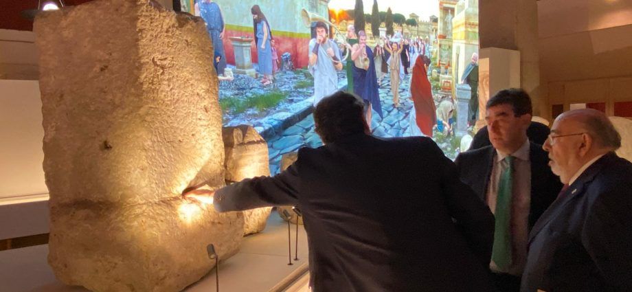 El Alcalde, Miguel Ángel Medranda contempló el Ara o Árula junto al Director del Museo Arqueológico Regional de la Comunidad de Madrid, D. Enrique Baquedano.
