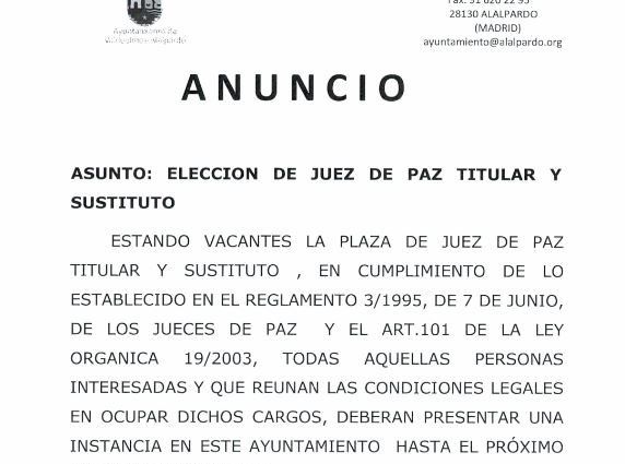 Estando vacante el puesto de Juez/a de paz y sustitut@, todas aquellas personas interesadas y que reúnan las condiciones legales para ocupar dichos cargos, deberán presentar una instancia en el Ayuntamiento hasta el 30 de septiembre.