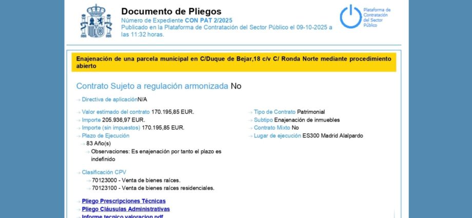 Enajenación de una parcela municipal en C/Duque de Bejar,18 c/v C/ Ronda Norte mediante procedimiento abierto